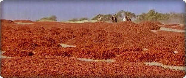 Красный перец, как цвет крови, которая вот-вот прольется при штурме ворот, где, кроме спасшейся Сонабай, работницы - односельчанки тоже оказались заложниками сложившейся ситуации.