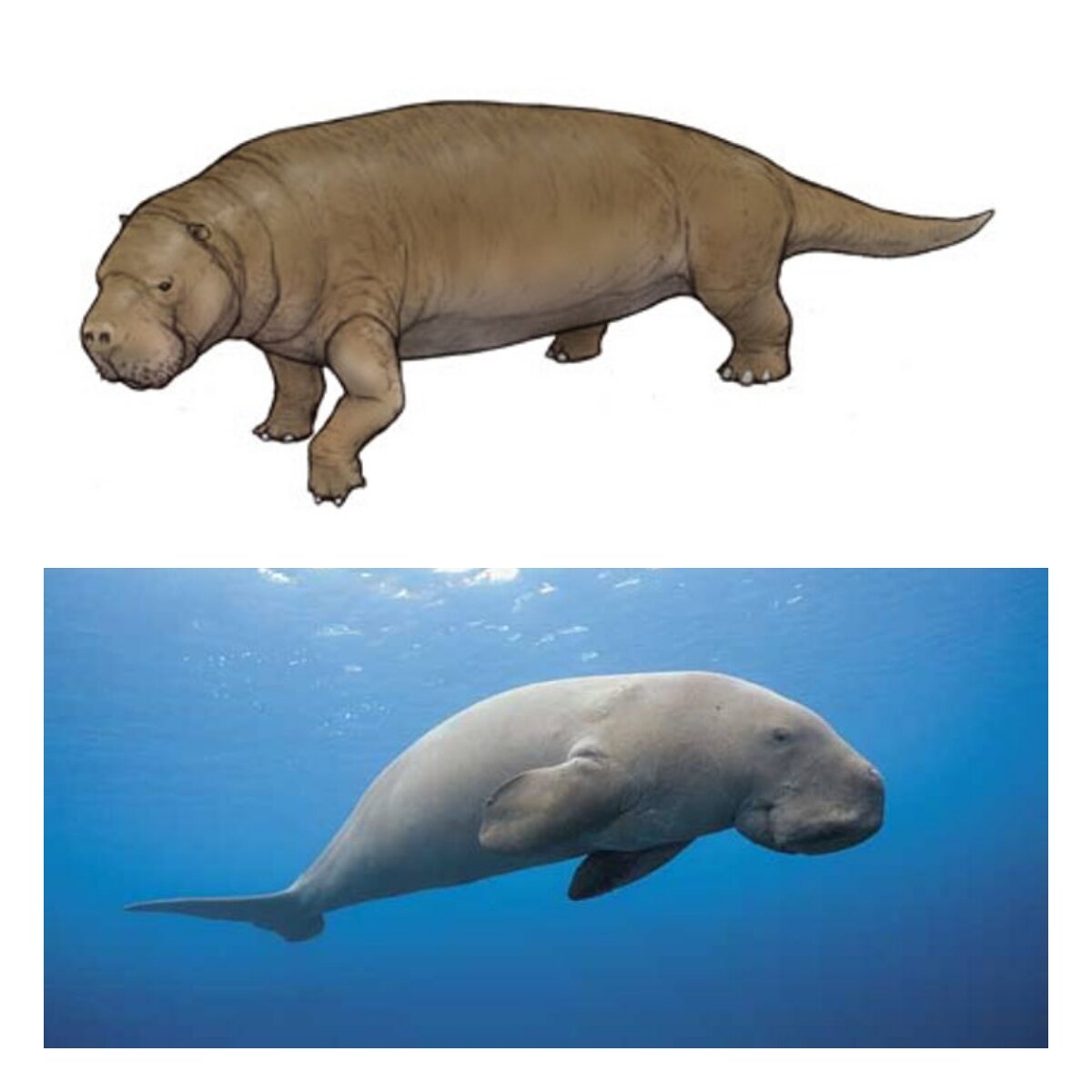 Мы привыкли знать, что жизнь на Земле вышла из воды и променяла ласты на лапы. Но история знает и обратные факты: когда на суше животных ждал не самый теплый прием и они вернулись назад, в воду. Из существующих сейчас к таким особям относятся дюгони, тюлени и киты. Трудно представить, что их предки когда-то были абсолютно сухопутными животными. Так как же они выглядели? Дюгонь → Пезосирен Дюгони относятся к классу сирен. Это медлительные млекопитающие, которые питаются растительной пищей. У дюгоней массивное тело длиной более 4 метров и толстая кожа в складку. Масса животных порой достигает 500 кг. Вы удивитесь, но ближайшие родственники дюгоней - даманы (маленькие травоядные зверьки) и слоны. У предка сирен - его звали "Пезосирен"- было мощное туловище и четыре лапы, а выглядел он вот так: Тюлени → Пуйила Тюлени произошли от того же предка, что и семейство куньих. Этим доисторическим животным была Пуйила - сухопутное млекопитающее с головой куницы и туловищем тюленя. Пуйила оди