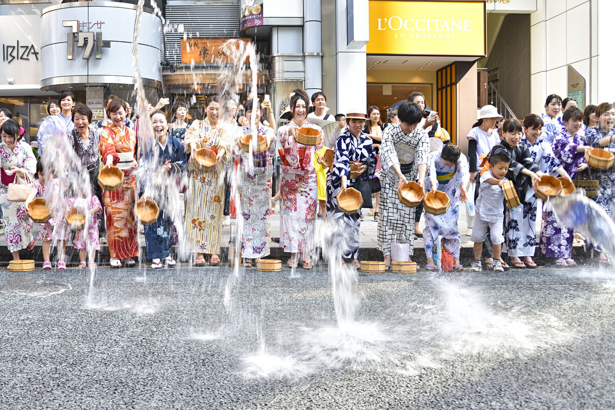 Погода в Японии радует ясными солнечными деньками, но не всем такие дни по душе, поэтому в дело идут синтоистские обряды. 打ち水(Учимизу) - японская традиция обливания водой земли и улиц. Хоть учимизу уходит корнями в ритуальные обряды, но все-таки сейчас воспринимается японцами как пример национальных ценностей, ведь сочетает в себе эстетическую составляющую и практический смысл. Учимизу зачастую проводится массово в рамках какого-либо мероприятия, участники которого одеваются в традиционную одежду - юкату. Воду разбрызгивают из деревянной утвари. Проведение мероприятий с учимизу в первую очередь для жителей Японии является жестом вежливости и доброжелательности к окружающим Желающим присоединиться к обычаю советуют делать это ранним утром или вечером, но не в самую жару, а также стараться экономно расходовать воду и разливать использованную, например, после купания.