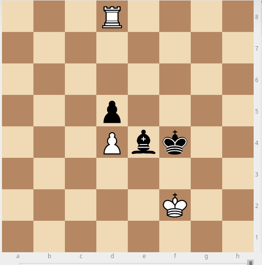Всё, план выполнен, пора собирать урожай: теперь, после взятия ладьёй пешки, если чёрные возьмут слоном ладью, белые забирают слона королём с очевидно выигранной позицией - король белых имеет возможность встать от чёрного короля по другую сторону вертикали, по которой движется пешка, если ладью не брать - она возвращается на вертикаль "e", делая чёрного короля пассивным наблюдателем, того, как белый король проталкивает свою пешку к полю превращения, и результат очевиден: