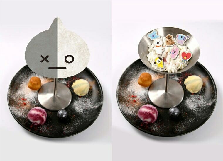 Вот такое меню BT21 можно увидеть одном из кафе в Токио, Япония. С каждым днем не только BTS становятся всемирно известными, но и персонажи BT21, созданные ими. 1) Космическая тарелка - VAN 2) Парфе (слоёное мороженое с вкусовыми наполнителями) - Koya 3) Десерт со сладкой ватой - RJ 4) Протеиновый блинчик - Cooky 5) Шоколадное фондю (небольшие кусочки фруктов, ягод или бисквита в шоколадной глазури) - Shooky 6) Тушеный рис - Mang 7) Гамбургер - TATA 8) Желтое карри - Chimmy Что Вы из этого меню хотели бы попробовать?