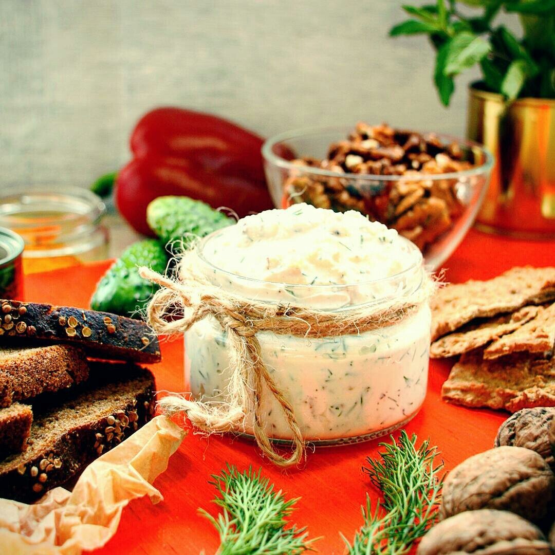 Ингредиенты: Творог 0% - 100 грамм Молоко 2,5% - 25 грамм Сметана 15,0% - 20 грамм Орех грецкий - 20 грамм Чеснок - 2 грамма Укроп - 3 грамма Соль - 2грамма Перец черный молотый - 1 грамм Готовим: 1. Чеснок пропустить через пресс. 2. Орехи мелко порубить. 3. укроп - нарезать. 4. Творог, сметану и молоко тщательно растереть. 5. Смещать все ингридиенты - дать настояться в холодильнике пару часов. Можно поступить проще - сложить все игредиенты в чашу блендера и перемолоть, вкус будет тот же, но выглядеть паста будет хуже. Калорийность: в 100 граммах содержится: 159 кКал | 13,1 г белка | 9,8 г жира | 4,6 г углеводов