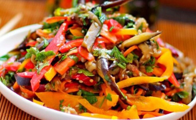 Прекрасный салат-закуска для любителей остренькой и экзотической кухни! Готовится очень просто и очень быстро, да и получается очень вкусно! Ингредиенты: Баклажаны - 2 шт. Морковь - 2 шт. Болгарский перец (желательно красный) - 2 шт. Лук репчатый - 1 шт. Растительное масло - 200 мл. Уксус (желательно яблочный 9%) - 5 ч.л. Приправа "для морковки по-корейски" - 5 ч.л. Чеснок - 4 зубчика Соевый соус - 50 мл. Перец (красный молотый) - 0,5 ч.л. или по вкусу Соль - 0,5 ч.л. Сахар - 3 ч.л. Зелень - 1 пучок Приготовление: 1. Баклажаны нарезаем тонкими длинными брусочками и отправляем их в микроволновку (на максимальной мощности) в посуде с крышкой на 5 минут. 2. Нарезаем болгарский перец тонкими полосочками, морковь шинкуем на "корейской" терке, лук нарезаем тонкими полукольцами. 3. К овощам добавляем баклажаны из микроволновки, чеснок, пропущенный через чеснокодавку, мелко нарубленную зелень, приправу, соль, сахар. 4. Заливаем салат раскаленным растительным маслом. 5. Добавляем соевый соус