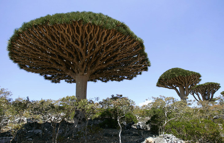 Остров Сокотра находится в Индийском океане и является объектом Всемирного наследия ЮНЕСКО. Здесь находятся сотни уникальных растений и животных, в том числе дерево «Кровь дракона». В начале 1880 года первая исследовательская британская экспедиция, возглавляемая профессором Исааком Балфоуром, прибыла на остров Сокотра. Ученые намеревались собрать коллекции горных пород животных и растений. Результаты ботанических исследований получились, ошеломляющими: за 48 дней на Сокотре обнаружили более 200 видов неизвестных науке растений, часть которых относилась к 20 новым родам. С той поры за островом прочно утвердилась слава ботанического рая, его стали называть «Галапагосами Индийского океана». (Фото Rod Waddington): Остров Сокотра, вид из космоса. Слева — побережье Йемена, внизу — Сомали. (Фото НАСА): Знаменитый пляж Каланасия. В 2003 году Сокотра вместе с другими островами архипелага была объявлена биосферным резерватом. (Фото Reuters | Alistair Lyon): По данным переписи 2004 года на остр