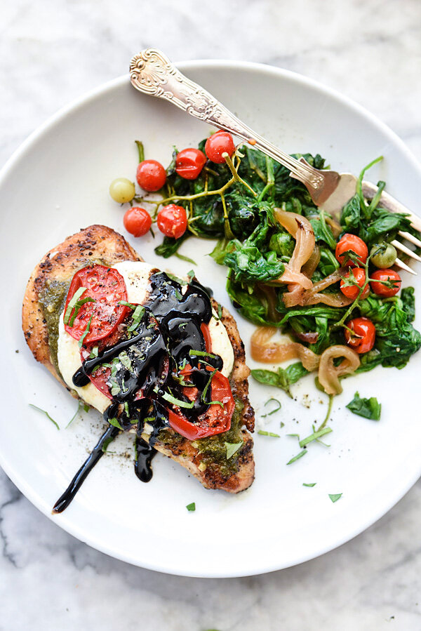 С помощью всего лишь нескольких простых ингредиентов, в том числе купленных в магазине песто и бальзамика, вы можете приготовить этот здоровый, выдержанный, ужин из куриной грудки менее чем за 30 минут. Разогреть духовку до 200 градусов. Используйте острый тонкий нож, чтобы нарезать куриные грудки наполовину. Натереть с обеих сторон солью и свежемолотым черным перцем. Нагрейте большую жаростойкую сковородку на среднем огне и добавьте оливковое масло.Добавьте куриные грудки в сковороду, стараясь не напихивать. Жарить на каждой стороне до слегка коричневого цвета, по 3-4 минуты каждый. Натереть верхнюю часть каждой куриной грудки базиликом и песто, около 1-2 столовых ложек на куриную грудку. Положите на курицу моцареллы и несколько ломтиков помидоров. Положите сковородку в духовку и запекайте 10-12 минут. Достаньте из духовки и украсьте свежим базиликом и полейте бальзамической глазури. Вкусно сочетается с гарниром из шпината, печеным картофелем или коричневым рисом!