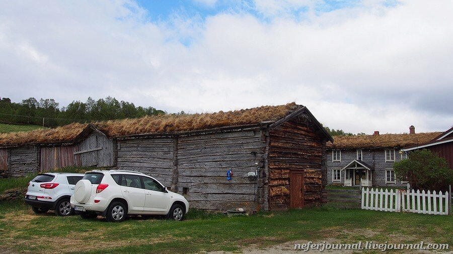 Мы не могли не сделать остановку, уж очень колоритными были домики. Около них забавно выглядят современные автомобили, как будто искривление времени и пространства. Так чем же хороша зеленая крыша? Во-первых, энергосбережение. Дерн препятствуют нагреванию кровли летом и сохраняет тепло зимой. Внутри будет более сбалансированная температура. Во-вторых, это отличный шумоизолятор. Дождь и птицы не будут вас беспокоить. Плюс травяной покров защищает крышу от ультрафиолетового излучения и механических повреждений. Однако есть и недостатки, например, большой вес. Квадратный метр сухого дерна - это примерно 50 кг, а после дождя вес увеличивается до 90 кг. При строительстве дома надо брать это в расчет.