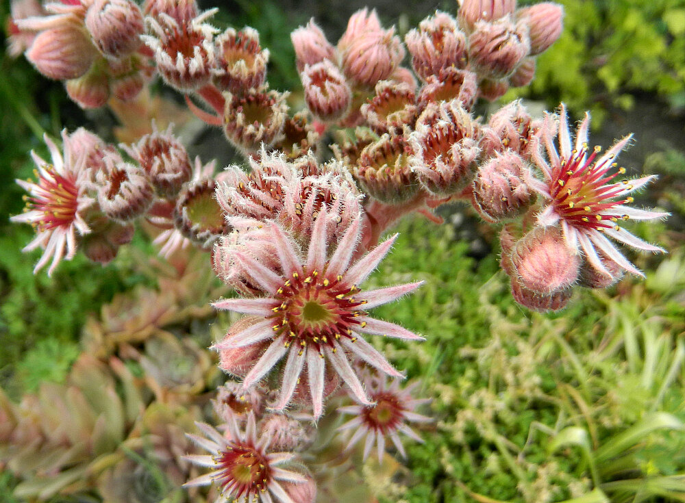 В моем саду зацветает молодило. Из его розочкоподобных розеток (недаром его еще называют каменная роза) поднимаются высокие цветоносы, покрытые чешуйчатыми листочками, а на их концах образуются многочисленные бутоны, которые наконец-то начинают раскрываться – и перед вами появляются необыкновенные цветочки, очень похожие на звездочки. Они небольшие, красноватого цвета, имеют много остроконечных лепестков, а в серединке торчат тычинки. У нас на Алтае молодио растет в горных районах – именно из путешествий по Горному Алтаю и привезла первые растения молодила. А потом еще раздобыла несколько разных видов молодил. Сейчас у меня в саду растет 4 вида этого удивительного растения. У него есть и еще одно название – заячья капуста. Относится это растение к семейству толстянковые и включает в себя 30 видов. Еще говорят, что молодило вечноживущее растение, наверное потому, что вокруг него постоянно образуются маленькие детки, которые продолжают род. С их помощью растение и размножается.