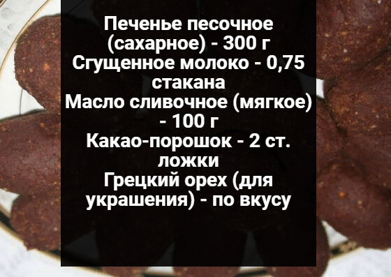 Люблю рецепты быстрого приготовления и стараюсь сама придумывать все больше и больше! Сегодня расскажу Вам как можно быстро и без хлопот приготовить пирожное картошка) Обязательно поставьте мне оценку своими красивыми пальчиками палец вверх ☝)) Продукты: Способ приготовления: 1. Печенье ломаем на куски. 2. Добавим к нему сгущенку, перемешиваем. 3. Мягкое масло так же отправим в данную массу. 4. Остается добавить какао, и формируем пирожное(форму можете придумать). 5. Пирожное готово, можете хранить в прохладном месте. Приятного Аппетита!!!! Попробуйте так же: Быстрые сырные лепешки Лепешки из 3-х продуктов Сыр домашний со специями Чипсы в микроволновке Печенье с кунжутом за 10 минут Королевская рыба Колбаса из курицы Сыр моцарелла за 30 минут Заварное дрожжевое тесто Подписывайтесь и Вы найдете много интересного и самых простых рецептов на Нашем канале!