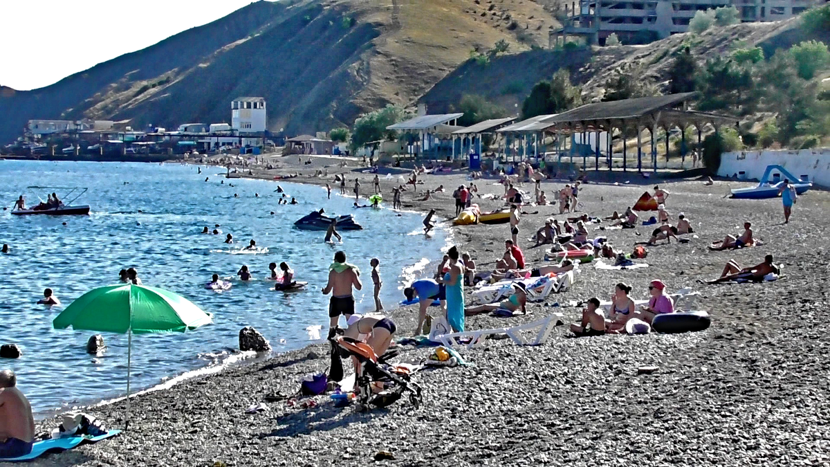 А теперь подробнее про Курортное и с чем его едят.))В границах поселка три чётко выраженных места где можно купаться и загорать. Пляж непосредственно примыкающий к набережной- основной контингент там мамы с детьми из пансионата "Крымское Приморье",отдыхающие по путёвкам мэрии Москвы. На скриншоте в центре. Протяженность около 350 метров. Пляж галечный.Навесы и лежаки в наличии,на набережной,напротив пляжа, обычно стоит газель с дежурным врачом. Следующий пляж,на схеме он слева,некоторыми называется "Пионерским".Раньше это был пляж сначала пионерского,а потом детского лагеря. Сам лагерь давно закрыт и заброшен,но капитальные навесы остались. Длина по береговой линии примерно 450 метров. Официально этот пляж не работает,но тем не менее его убирают,есть прокат катамаранов. Под навесами можно арендовать лежаки.Как раз,благодаря владельцам этого небольшого бизнеса пляж и поддерживается в таком приличном состоянии.По моему мнению - этот пляж даже чище центрального, а то что он больше и ш