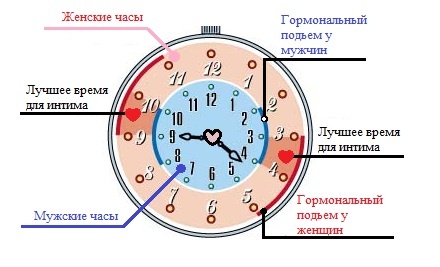 Существует определенное время, когда биологические ритмы мужчин и женщин совпадают. У каждого человека есть свои внутренние биологические часы, по которым мы живем. Наше половое влечение тоже подчиняется этим ритмам. Есть определенное время, когда сексуальное возбуждение наиболее сильное. Сексуальная активность, как мужская, так и женская, возникает несколько раз в сутки, а точнее – четыре раза. К счастью, эти временные периоды практически совпадают. У женщин всплеск сексуальной активности активизируется в следующие временные отрезки: Утро – 9 – 11 часов. День – 15 – 17 часов. Вечер – 21 – 23 часов. Ночь – 3 – 5 часов. У мужчин же эти периоды активности сдвинуты на один час назад и влечение наиболее сильное в следующие часы: Утро – 8 – 10 часов. День – 14 – 16 часов. Вечер – 20 – 22 часов. Ночь – 2 – 4 часов. Если сравнить эти временные отрезки у женщин и мужчин, то будет видно, что есть периоды, когда происходит их наложение друг на друга, и за сутки их набегает аж целых четыре «с