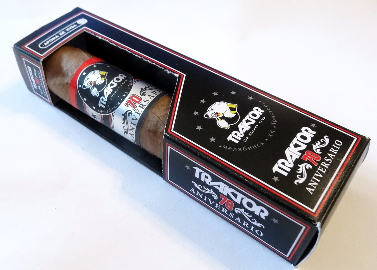 Об этой сигаре точно известно... да почти ничего! После дегустации я прошерстил массу ресурсов и не нашёл ничего! Кроме того, что сигара эта сделана по заказу сигарного клуба "Южный Урал" на 70-летний юбилей Челябинского хоккейного клуба "Трактор". Отсюда и название витолы. Изготовитель - московская компания Siglo de Oro, известная такими брендами как "Евгений Онегин", "Siglo de Oro", "Yoruba", "Pelo de Oro", "Hidalgo" и именными сигарами в рамках проекта "Великие имена — великие сигары". Ещё известен тираж - всего 200 сигар! Может по этому о ней нет информации?! На моём экземпляре стоит номер 162. Не знаю когда она была заказана и скручена, но впервые анонсирована - 2 апреля 2018 года, когда ХК "Трактор" играли матчи финала Восточной конференции. Ну, что ж... будем пробовать. Сигара упакована в красивый картонный блистер, с краткой информацией, номером и красочным логотипом хоккейного клуба. Бант шикарен! Скрутка равномерная, без провалов или уплотнений. Витола формата робуст