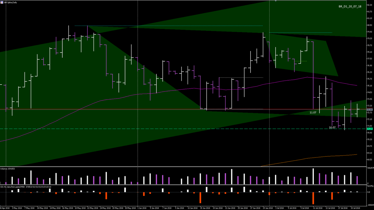 Br-8.18 Сегодня, будет рассмотрен дневной график, фьючерса нефти марки Брент. Точнее сказать, правая, крайняя его часть. На мой взгляд, пример очень выразительный и принцип сравнения баров, будет понятен даже новичку. Движение инструмента с середины мая в диапазоне, заметно невооруженным взглядом. Одиннадцатого июля образовывается даун-бар с очень широким спрэдом, хорошим результатом, объёмом и дельтой. Ожидание от подобного бара - продолжение шорта. Но появление покупателя, задерживает цену внутри бара, на два дня. Шестнадцатого июля - день продаж. Снова даун-бар, но уже со слегка меньшим (в сравнении с первым даун-баром 11 июля) спрэдом, объёмом и дельтой. Есть очевидные основания предполагать, что силы продавца поиссякли и активизироваться покупателю, самое время. Если в ближайшее время, мы не увидим цену выше 76.00, то буду ожидать обновления минимумов в районе 70-67 долларов за баррель. Пытаясь заглянуть в ближайшую перспективу, есть надежда увидеть цены повыше, пока восходящий т