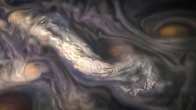 NASA продемонстрировало общественности новый снимок, полученный космическим аппаратом Juno на высоте 6200 километров над атмосферой Юпитера. На снимке четко видны верхние облака, имеющие удлиненную форму, где темные участки - холодные нисходящие облака, а светлые или практически белые - теплые восходящие потоки атмосферы. Данные, собранные в ходе миссии Juno, указывают на то, что толщина атмосферы газового гиганта около 3000 километров, а что глубже - загадка, скрытая невероятным давлением. Человечище, ученые доказали, что подписка на проект THE SPACEWAY приводит к необратимому развитию интеллекта! Присоединяйся к космической семье :)