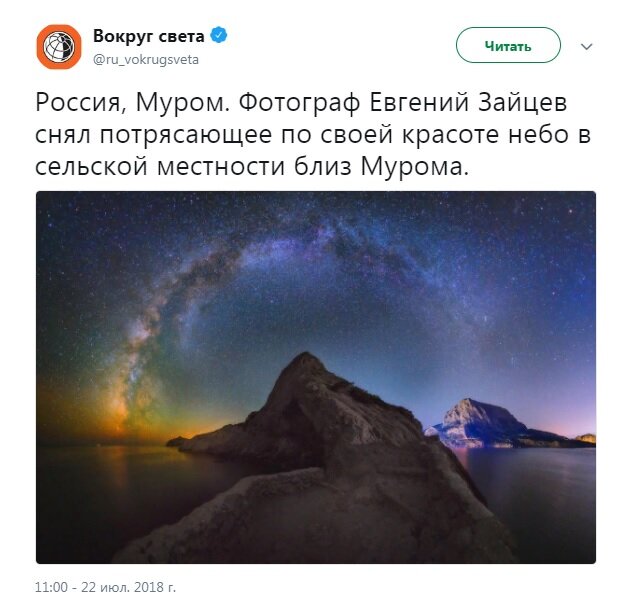 Сегодня популярный журнал «Вокруг света» разместил в социальных сетях фотографию Евгения Зайцева, которому удалось снять потрясающее по своей красоте небо в сельской местности близ Мурома. Все было бы замечательно, если бы на фото на самом деле не оказался запечатлен Млечный Путь над горой Коба-Кая из Республики Крым. Ранее этот же снимок, но с верной надписью был размещен на сайте другого популярного журнала National Geographic Россия. Что самое интересное, авторство фото принадлежит одному человеку - Евгению Зайцеву. Судя по всему, ему удалось получить неплохой гонорар за один снимок сразу в двух редакциях.