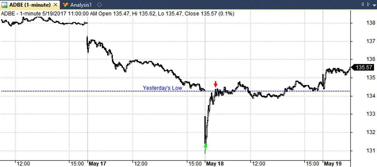 На следующем графике показана типичная для данной стратегии сделка на закрытие гэпа. Мы видим, что 18 мая ADBE открывается более чем на 1% ниже Low предыдущего дня. Поэтому мы открываем позицию в лонг на следующем 1-минутном баре.