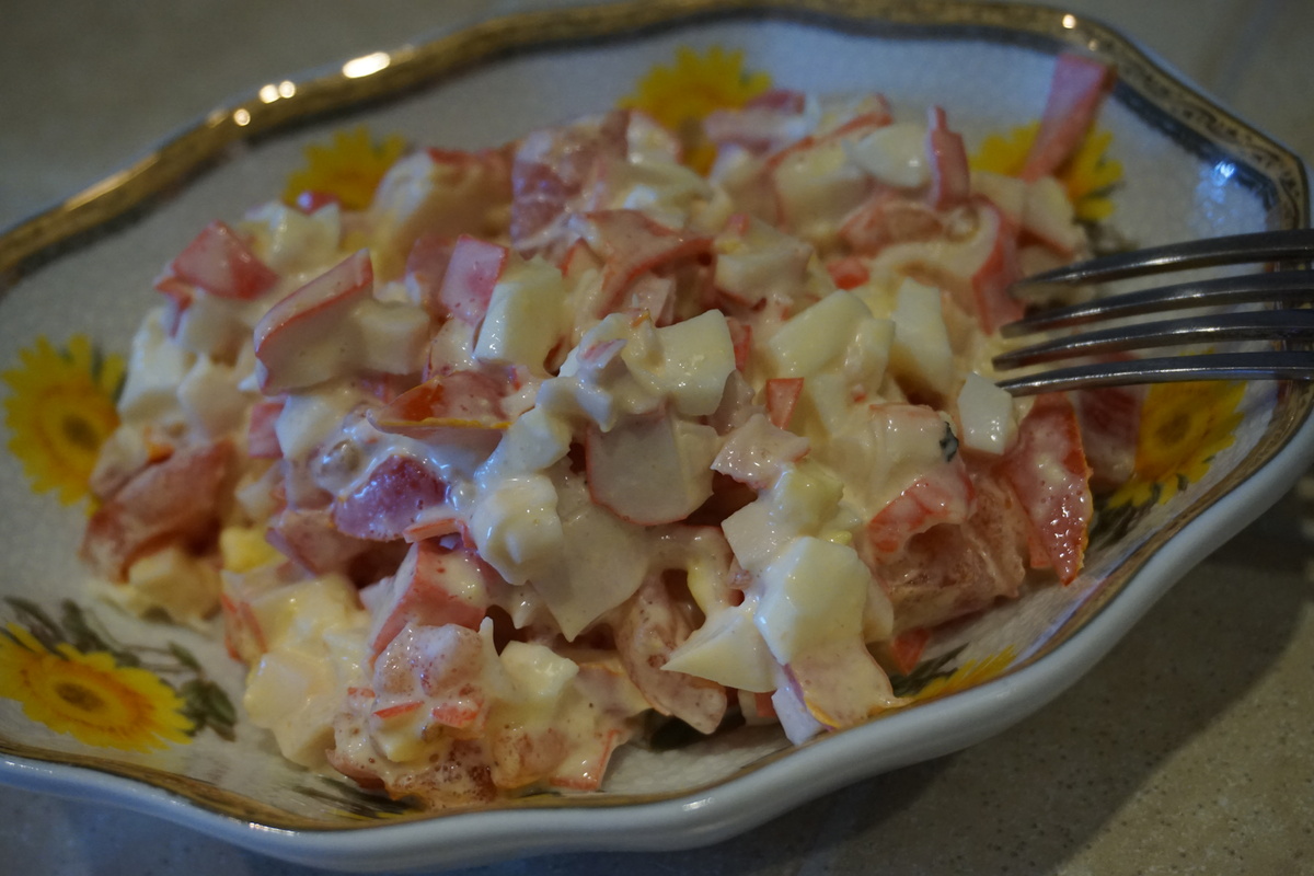 Салат готовится за 5 минут, имеет низкую калорийность - 92 ккал в 100 г, Б - 6.7 г, Ж - 3 г, У - 9.2 г. В порции 240 г, чтобы наесться, а это всего 230 ккал. Что потребуется для салата: Всё измельчаем так, как вы любите. Томаты дают много сока, поэтому смазывать соусом можно по желанию. Скажу честно, я добавляю в порцию чайную ложку майонеза. Это, конечно, прибавляет 30 ккал к порции, но не критично. Салата выходит на две порции. Я ем без хлеба, поэтому всё хорошо. Томаты дают клетчатку и витамины. Он мне никогда ещё не мешал получить отвес на утро. Вкус - необычайно яркий, хорошо умеряет голод и после него не хочеться есть ещё 2-3 часа. Главное, что в этом блюде достаточно разнообразное количество нутриентов: есть витамин А - отвечающий за красоту и состояние кожи, есть вся группа витаминов В, укрепляющая нервную систему, Е, К, С, а так же микроэлементы практически, все по списку. Во как! Я думаю, вам понравится мой рецепт этого диетического блюда. Друзья, заходите на канал к Ягодке