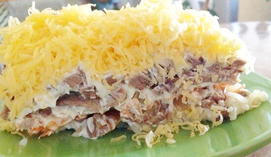 Абсолютно несложный, быстрый рецепт слоеного салата из продуктов, что всегда под рукой. Зато вкус порадует даже искушенных! Проверено лично! Приготовление: Перво-наперво мы отвариваем мясо. Потребуемся 300 грамм. Можно взять говядину или язык, кому как больше нравится. Затем мы жарим лук. Хватит и одной луковицы. Мы ее мелко режем и отправляем в растительное масло на сковороду. Когда появится золотистый цвет, выключаем газ и остужаем. Не все любят жареный лук в салатах. Но здесь мы используем маринованные грибы 150г . И лук для них является прекрасным сочетанием. Эти 2 продукта и будут нижним слоем нашего салата. Каждый пласт промазываем смесью майонеза и сметаны. Нам нужно по 200 грамм каждого вида. В крайнем случае, если останется лишнее, всегда можно найти применение. Затем выкладываем вареные картофель – потребуется 2 штуки – и одну морковку, потертые на терке. Следующим слоем идет мясо. Поверх натираем 250 грамм твердого сыра. Для украшения отлично подойдут ломтики лимона и зеле