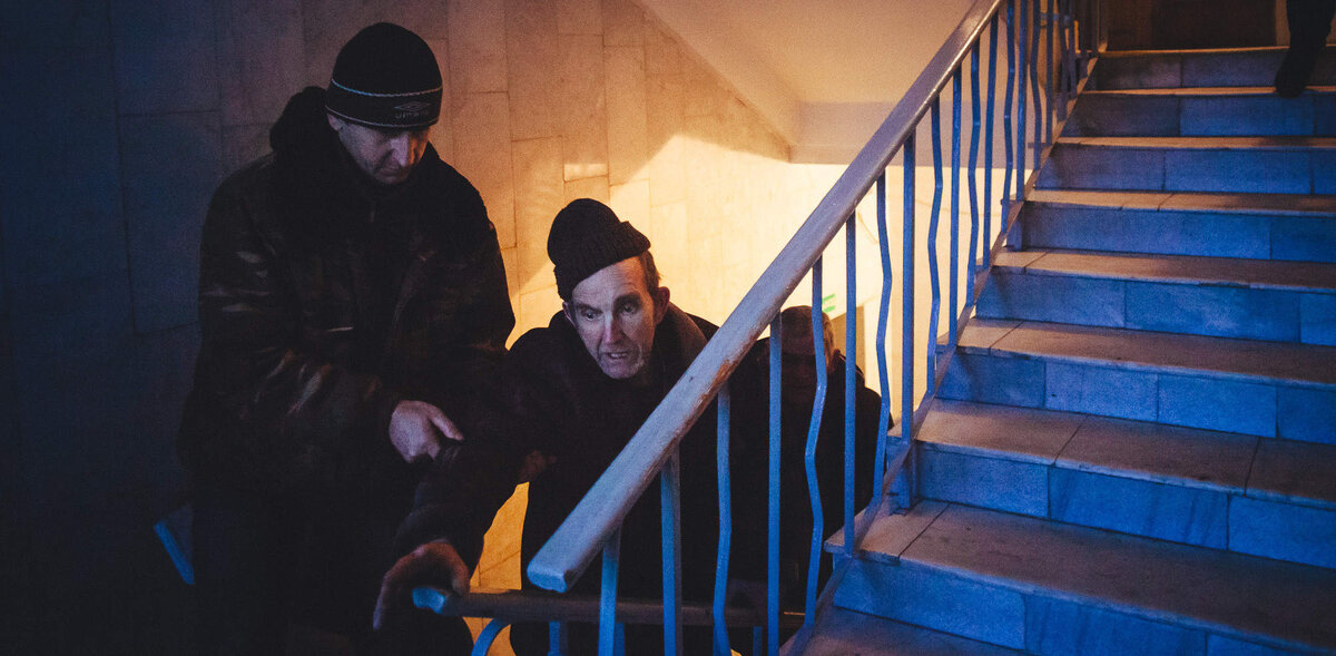 Человеку, который перенес черепно-мозговую травму, работники поликлиники помогают спуститься с лестницы.Видео: Александр Васюкович, «Имена»