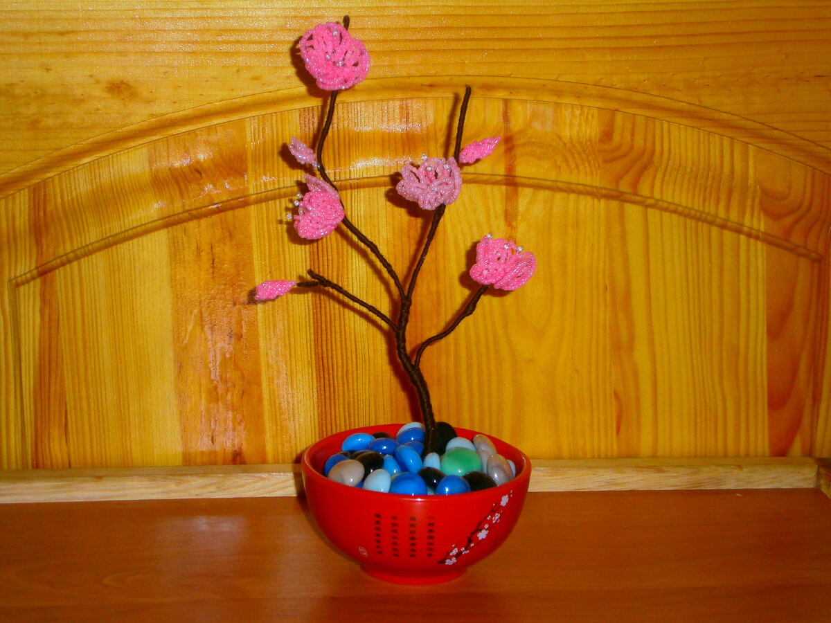 Очень красиво и естественно выглядит сакура изготовленная из бисера. Сакура это красивая китайская слива. Цвет её цветов розовый. Когда деревце цветёт то листьев на ветках совсем не видно.