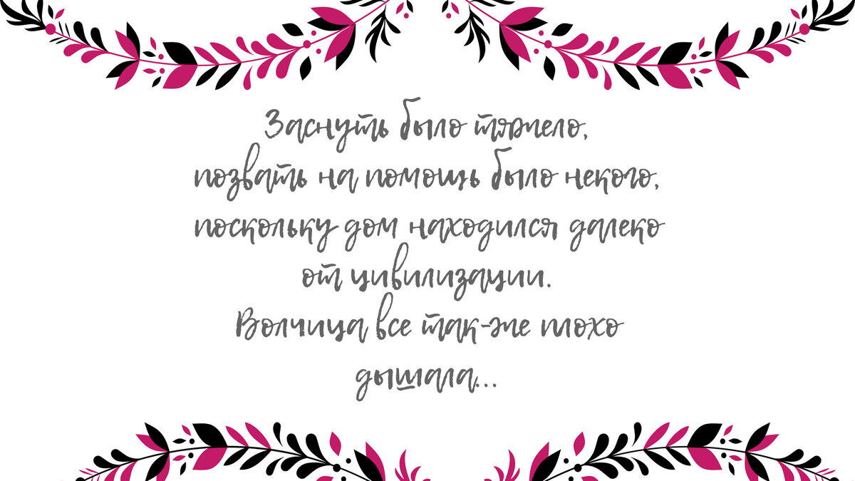 Заснуть было тяжело, позвать на помощь было некого, поскольку дом находился далеко от цивилизации. Волчица все так-же плохо ды..