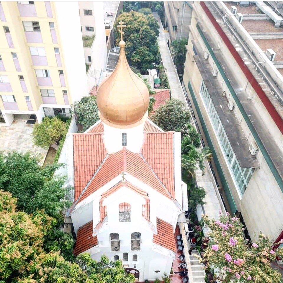 Вот наш храм - Никольский собор, построен в 1938 году белой эмиграцией из России. Раньше вокруг собора разливались кофейные плантации. В наше время храм и участок за ним зажат со всех сторон жилыми многоэтажками.