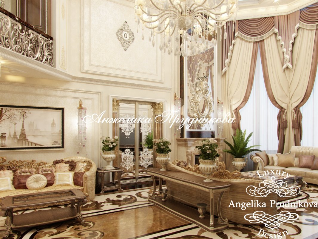 Дизайн интерьера коттеджа в стиле модерн в КП «Верхнее Валуево» выглядит респектабельно и аристократично благодаря кремовой цветовой гамме с коричневыми акцентами, эксклюзивной отделке и итальянским люстрам ручной работы. Плавные изгибы обитой бархатом и шелком мягкой мебели органично сочетаются с панелями буазери и лепным декором в классическом стиле, создающим в интерьере дворцовую атмосферу. А голубая LED-подсветка подчеркивает сложный рельеф авторских потолков и придает дизайну дома современное звучание. Гостиная со вторым светом и панорамным эркером выглядит ярко и нарядно. Пышный оконный декор, мраморные полы с узором из резного камня, декорированный зеркальным панно высокий камин, сверкающие нити хрустальных штор – созданный дизайнером Анжеликой Прудниковой интерьер в стиле модерн наполнен роскошью. Балюстрада второго этажа, повторяющая очертания эркера, парные колонны и симметрично расположенные крылья лестницы упорядочивают пространство, а изящный позолоченный декор д