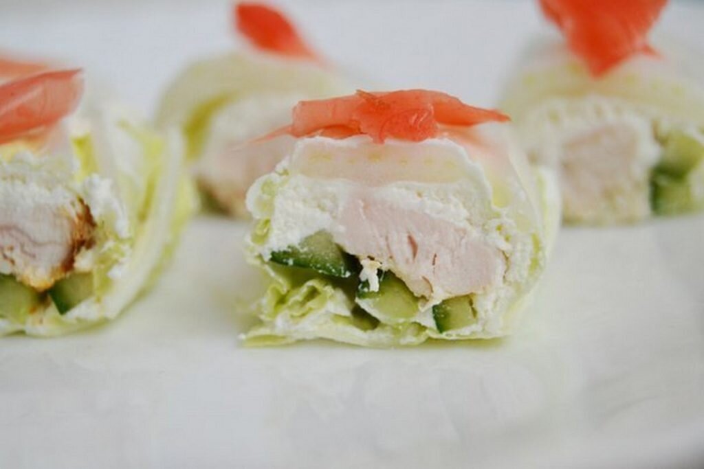 📌 Нам понадобятся: 2. 150-200 грамм капусты (пекинской) 3. Половина огурца 4. 100 грамм йогурта 5. Специи, соль 6. 150 грамм творога 📌 Приготовление: Вначале нужно отварить филе либо обжарить без масла. Нарезать остывшую грудку и огурец полосами. В творог добавить специи, соль и йогурт, перемешать. Отделить капустные листы. На каждый лист нанести творожную смесь, выложить полоски грудки и огурца. Свернуть листы рулетом и на 25 минут поставить в холодильник. Остывшие рулеты разрезать.