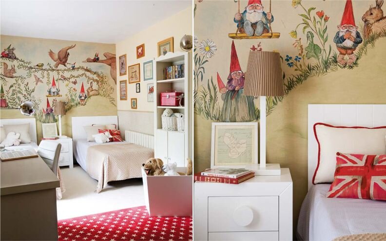 Сказочную атмосферу в детской помогут создать необычная настенная роспись и коврик из домотканого полотна.