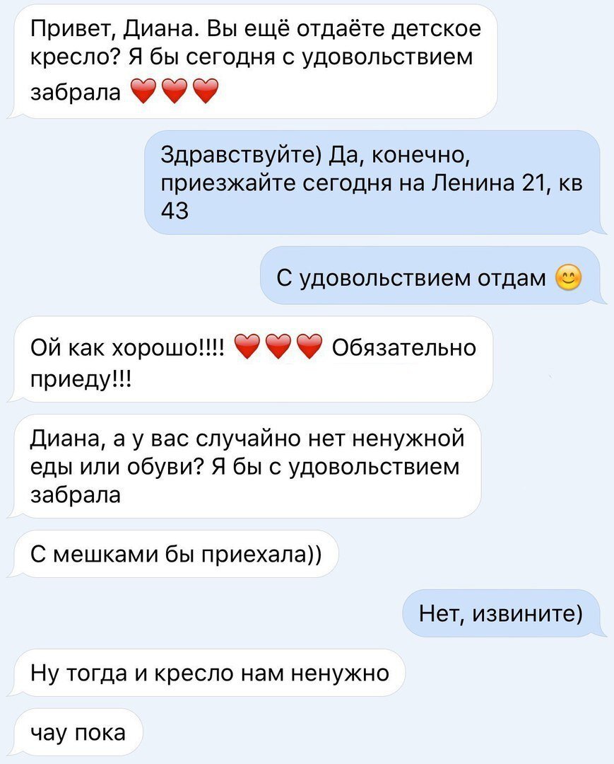 Собственно почему я не пытаюсь отдать даром детские вещи, а хоть за совсемдешево продаю на Авито. Пару раз пытался. Диалоги реальные. Практически калька с пары разговоров которые у меня были при попытке отдать некоторые вещи нахаляву.