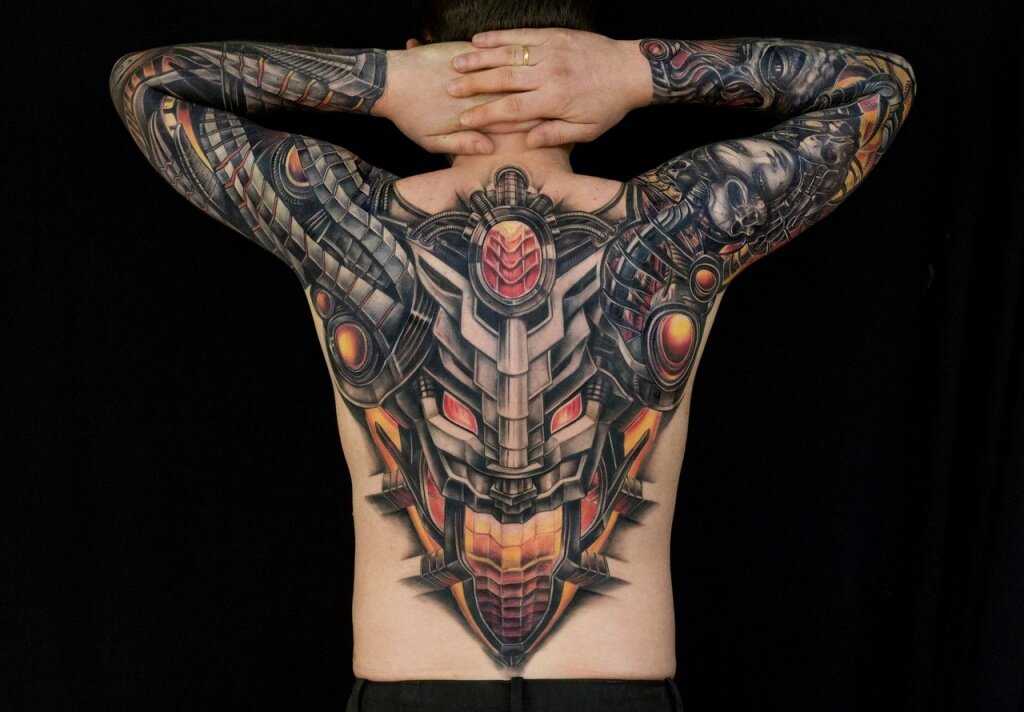 Стиль биомеханика впервые начали создаваться американцами примерно в восьмидесятые годы. Однако пик их популярности пришелся на 2000-е, возможно, потому что это великолепный символ новой эпохи человеческого развития, которую тяжело представить без: Сейчас же в век высоких технологий желающие сделать тату в этом стиле могут пойти в любой салон. Но не стоит доверять всем, тату делают на всю жизнь и нужно выбирать только проверенный тату салон. Тату Биомеханика. Татуировки в стиле биомеханика больше всего связаны как раз не с техникой, а непосредственно с человеком: Конечно, техника и прогресс лишь дополняют способности и возможности человеческого существа. Биологическая часть соединяется с механической. В искусстве это направление еще называют «фантастическим реализмом,» или же «гиперреализмом». Ярким художником, работающим в данном направлении, является Ганс Гигер и знать это немаловажно хотя бы потому, что многие тату-мастера стараются копировать его работы и перен