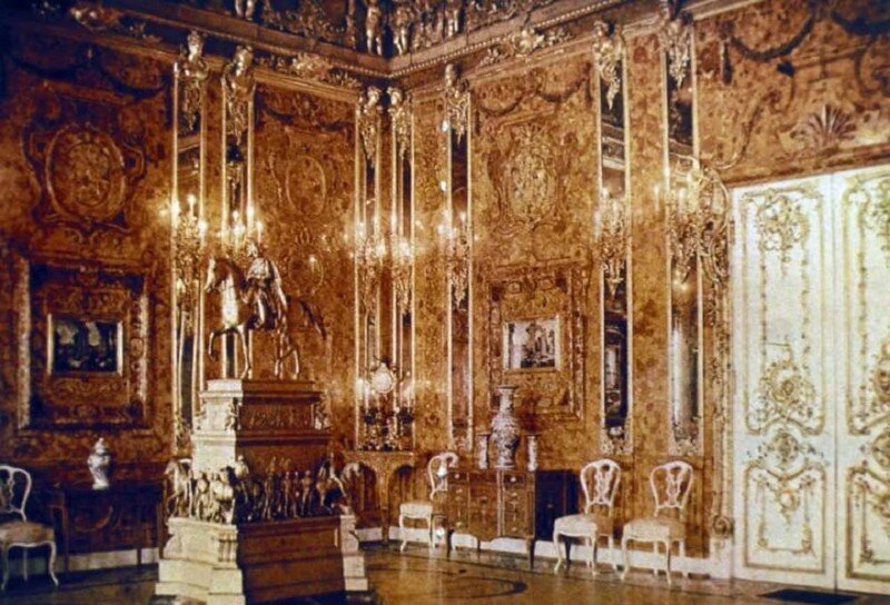 Таинственно исчезнувшие сокровища вдвойне привлекательны. Янтарная комната — «восьмое чудо света» — всегда была предметом вожделения правителей и царей. Говорят, Пётр I буквально выпросил ее у Фридриха во время встречи в ноябре 1716, когда был заключён союз между Россией и Пруссией. Подарком Пётр I тут же похвастался в письме Екатерине: «…подарил меня… кабинетом Янтарным, о чём давно желали». Янтарный кабинет упаковали и с большими предосторожностями переправили из Пруссии в Санкт-Петербург в 1717 году. Мозаичные янтарные панно установили в нижнем зале Людских палат в Летнем саду. В 1743 году императрица Елизавета Петровна поручила мастеру Мартелли под присмотром обер-архитектора Растрелли расширить кабинет. Прусских панелей явно не хватало на большой зал, и Растрелли ввёл в отделку золочёную деревянную резьбу, зеркала и мозаичные картины из агата и яшмы. И к 1770 году под надзором Растрелли кабинет преображается в знаменитую Янтарную комнату Екатерининского дворца в Царском Селе, при