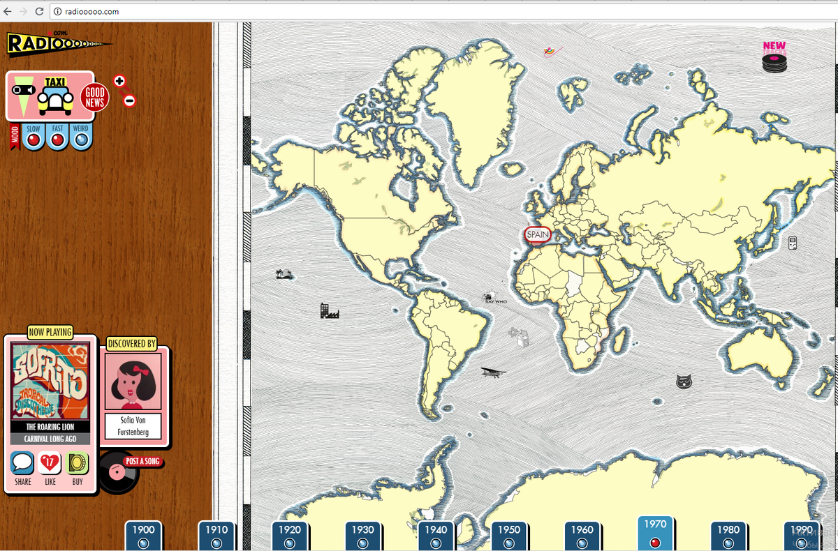 Сайт представляет из себя карту мира и временную шкалу, расположенную под картой. Вы можете выбрать любое десятилетие и любую страну и послушать традиционный для того времени плейлист. Не знаю как вы, ребят, но до этого сайта я понятия не имела, что слушали в 40-х в Конго. Или как звучит грузинская музыка 20-х годов. Шагая назад во времени, можно услышать, как изменяется не только само звучание, но и манера пения. Чего только стоит безбожно картавящий Александр Вертинский. Удивительно, но многим записям здесь — более ста лет!