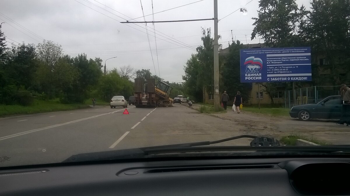 В Орле с автотрала "удрал" бульдозер ДТП произошло сегодня, 24 июля, около полудня на улице Электровозной. Бульдозер сошел с транспортирующего его автотрала. Фото с места происшествия появились в группе Город Орел [KONUBRI] в соцсети «Вконтакте». Движение затруднено. Автомобилистам приходится объезжать помеху по встречной полосе, пересекая двойную сплошную в нарушение ПДД.