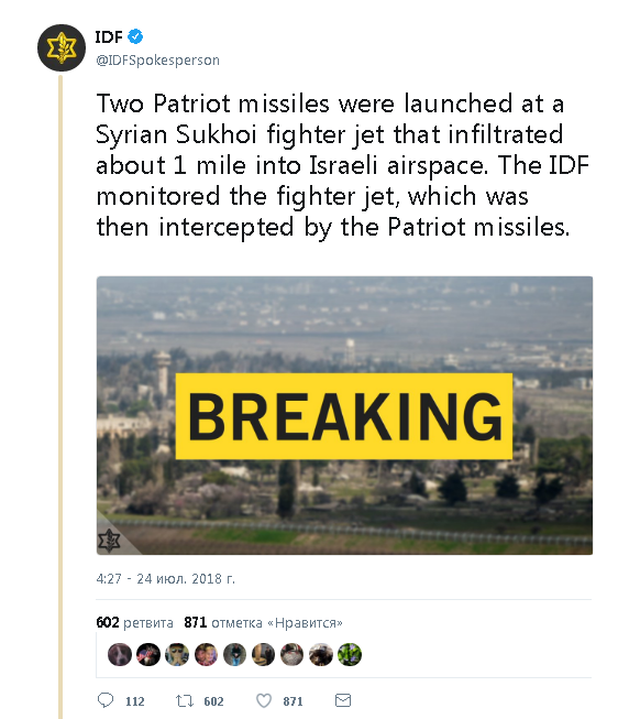 " Две ракеты "Пэтриот" были выпущены по сирийскому истребителю "сухой", который проник в израильское воздушное пространство примерно на милю. ЦАХАЛ контролировалт реактивный истребитель, который затем был сбит ракетой Patriot, "- говрится в сообщении ВС Израиля в Твиттере, " С сегодняшнего утра наблюдается рост внутренних боевых действий в Сирии и деятельности ВВС Сирии. ИДФ находятся в состоянии повышенной готовности и будут продолжать действовать против нарушения соглашения о разъединении сил 1974. "