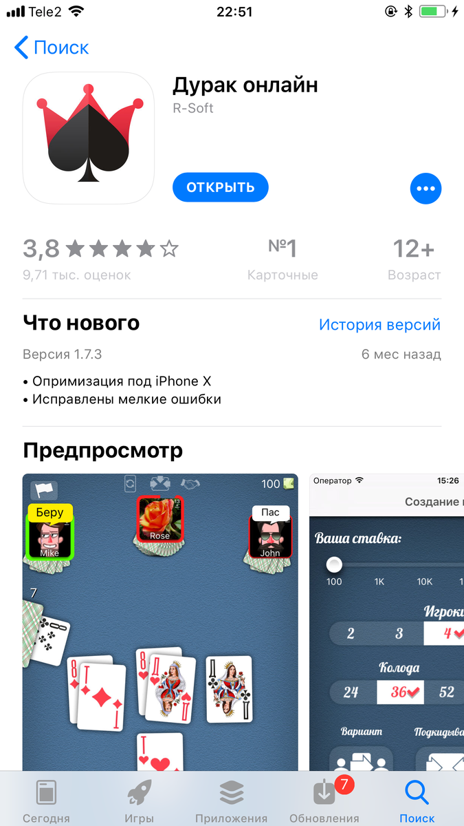 Всем привет! Сегодня бы хотелось поделиться с карточной игрой "Дурак онлайн" для мобильных платформ. Мое знакомство с ней получилось довольно неожиданным, в университете между парами надо было себя занять чем-то, кроме булочек и шоколадок с чайком. И случайно в AppStore нашел это приложение в топе скачиваний. Скачал и мне понравилось, игра ведется на виртуальную денежную валюту, есть множество различных режимов, таких как: игра в переводного или подкидного дурака, разное количество человек в игре (от 2 до 6), количество карт 24, 36 или 52, есть режим игры с друзьями или абсолютно незнакомыми людьми. Каждый день при первой победе есть бонус к рейтингу. Изначально на балансе игры около 5000 виртуальных бумажек, если все бумажки проиграть, то раз в 6 часов можно взять абсолютно бесплатно 1450 денег. В игре есть донат, но и без него играется абсолютно спокойно, донат для тех, кто хочет получить красивые рубашки или премиум аккаунт, который ускоряет прогресс в игре (даже если у вас нет п