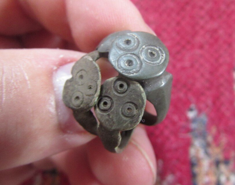 Имеются в моих закромах различные перстни от 15 до 20 веков. Среди них можно выделить несколько групп. В частности, легко выделяются вот такие три небольших перстенька с рисунками в виде кружков: Информации в интернете по подобным перстням не так уж и много, но вроде бы правильный ответ я все же нашел. Относятся они примерно к 15-19 векам. Изображенные кружки являются ни чем иным, как солярными (солнечными) узорами, призванными защитить человека. Как все знают, солнце у многих народов еще долго оставалось "самым главным", что есть в мире. И даже при распространении православной веры, многие люди того времени отдавали почести и солнцу, считая его символом удачи и процветания. А еще интересную версию прочитал на одном кладоискательском форуме. Там один человек уверял, будто количество кружочков означало количество рожденных женщиной детей. Версия интересная. Между прочим, перстеньки на фото скорее всего женские, так как ни на один мой палец они не налезут. А если у вас есть своя вер