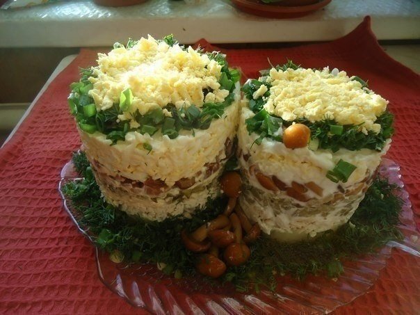 Ингредиенты: -тертый картофель, -куриное отварное филе, -тертый маринов. огурц, -маринов.опята, -тертые яйца, Приготовление Выкладываем слоями, промазывая каждый слой майонезом или натуральным йогуртом, сверху украшаем зеленью и тёртым желтком. Приятного аппетита!
