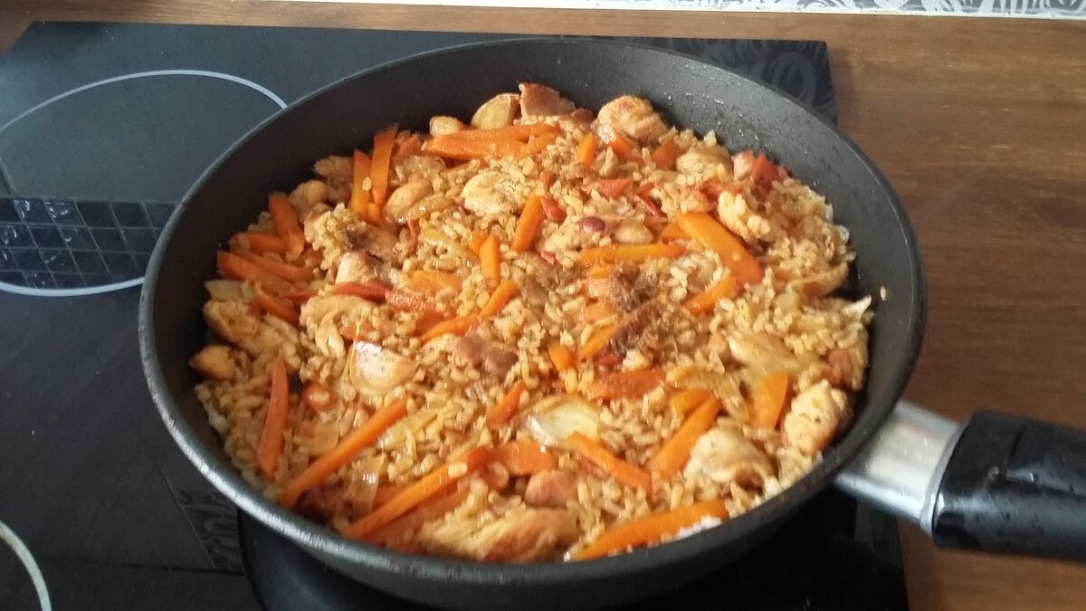 Продукты: Рис самаркандский - 250 гр Филе индейки - 250 гр Морковь - 2 шт, крупная, около 250 гр Лук репчатый - 2 шт, крупный, около 250 гр Чеснок - 3-4 зубчика, не чистить! Помидоры - 3 шт Масло растительное - 50 гр Специи: зира, перец черный молотый, соль, чернослив 3 шт. Готовим! 1. Подрумянить мясо в небольшом количестве масла, положить чеснок. Когда чеснок даст запах выложить нарезанный полукольцами лук и нашинкованную соломкой морковь. 2. Когда лук и морковь обжарятся, добавить нарезанные помидоры. Обжаривать десять минут. Добавить соль и перец. 3.Высыпаем промытый рис, тщательно перемешиваем и заливаем кипятком. Вода должна покрывать рис приблизительно на один сантиметр. Закрыть крышкой и убавить температуру нагрева плиты. Я готовлю на мощности конфорки в 2 единицы. 4. Растолочь в ступке зиру, не больше 1 чайной ложки, и добавить в плов. 5. Доводим до готовности, минут 20-25. Приятного аппетита!