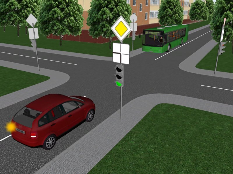 На самом деле этот вопрос на внимательность. Дело в том, что Правила однозначно говорят, что при проезде регулируемых перекрестков мы должны смотреть только на разрешающий или запрещающий сигнал светофора, а знаки приоритета мы в данном случае должны пренебречь. То есть легковой автомобиль и автобус движутся одновременно на разрешающий сигнал светофора, при этом легковой поворачивает налево. Таким образом при проезде перекрестка у него появляется помеха справа, которую он должен пропустить. Казалось бы все однозначно, но в этом вопросе появляются ошибки не только у курсантов автошкол, которым сам бог велел учиться на ошибках, но двигаясь по дорогам можно встретить нерадивых водителей, даже без знака "начинающий водитель", которые, находясь в положении красного автомобиля пытаются проехать в первую очередь и создают аварийную ситуацию на дороге. Есть еще один важный момент при повороте на перекрестке: какими бортами разъезжаться при обоюдном повороте налево? Этот вопрос мы рассмотрим в
