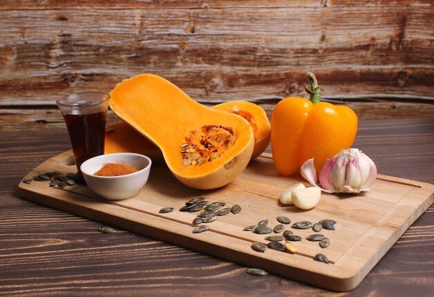Время приготовления: 40 минут Ингредиенты для приготовления Инструкция приготовления 1) Для приготовления возьмем небольшую тыкву, сладкий болгарский перец, пару тройку зубчиков чеснока, тыквенное масло и семечки, немного сухой паприки и прованские травы. 2) Болгарский перец очищаем от косточек и нарезаем на произвольные куски. 3) Из тыквы удаляем косточки, удобней всего это сделать ложкой. 4) Очищенную от плотной кожуры тыкву нарезаем на произвольные некрупные куски. 5) Нарезанные овощи складываем в кастрюлю. 6) Доливаем необходимое количество воды и ставим на огонь. 7) Доводим до кипения и добавляем чайную ложку соли. 8) Д