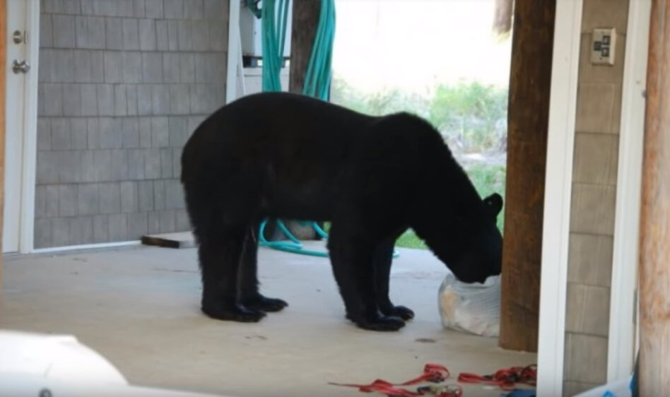 Большинство встреч медведей с цивилизацией заканчивается вызовом полиции и служб контроля за животными, которые специальными дротиками с транквилизаторами усыпляют животных и увозят обратно в лес. Один такой случай произошел в США штат Флорида. Полиция получила вызов из обычного жилого дома. Медведь проник в дом и стал рыскать по всем комнатам в поисках пищи. Хозяева, напуганные досмерти, быстро вызвали 911 и сообщили о диком животном в их доме. Вскоре полиция и бригада работников службы по надзору за дикими животными прибыли на место. Для обезвреживания и усыпления медведя уже был заготовлен дротик с транквилизатором. Одним выстрелом удалось попасть в медведя. Оставалось подождать несколько секунд, чтобы транквилизатор подействовал и медведь, почувствовав резкую сильную усталость, остановился бы и уснул. Но в этот раз медведь не остановился и продолжил убегать. Медведь испугался большого количества людей и выстрела в него. Он направился в сторону озера. Но тут как раз начал действоват