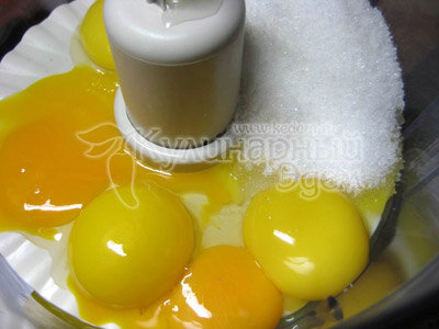 Для коржей: отделить желтки от белков. Большую часть сахара (около 120 г) взбить с горячей водой и желтками. Добавить к ним муку. Хорошенько вымесить тесто. Желательно взбивать его на кухонном комбайне, это быстро и менее трудоемко.
