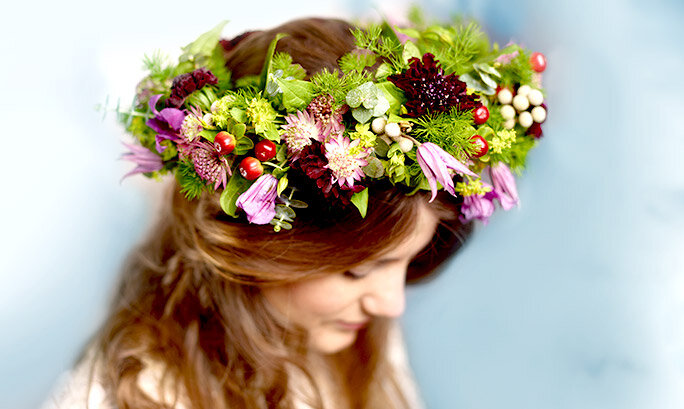 — Тонкая проволока. Оберни нить вокруг головы, чтобы снять мерку. Нить должна лежать на голове так, как если бы это был венок. Отрежь по мерке кусок флористической проволоки. Собери большой букет цветов и трав – во время шведского праздника середины лета Midsummer традиционно плетут венки из 7 видов полевых цветов. Плотно оберни их вокруг флористической проволоки, скрепляя с помощью тонкой проволоки. Добавляй цветы и травы послойно, до тех пор, пока не получится что-то вроде крупной гирлянды. Соедини концы проволоки вместе. Поздравляем! Твой изящный венок из цветов готов! Текст: София Мариньо де Лемос
