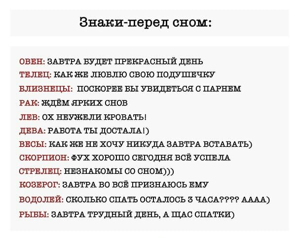Хочу поделится небольшим смешным постом о том, какие мысли преследует каждый знак зодиака перед сном;)