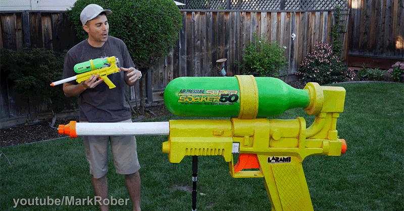 Кто-то в свободное время читает книги, кто-то смотрит телевизор, а бывший инженер NASA Марк Робер построил самый большой в мире водяной пистолет, к слову, попавший в книгу рекордов Гиннеса. Строительство пистолета заняло около 6 месяцев. Конструкция пистолета немного изменена. Бак, который держит воду, находится в рукоятке, а вода выталкивается через кончик пистолета с помощью сжатого азота. Если использовать специальные сменные сопла, то водяным пистолетом можно серьёзно покалечить и, возможно, даже сломать кости. Сила струи составляет 1 тонну на квадратный дюйм со скоростью 600 км/ч. Что примерно в 8 раз выше чем давление в пожарном рукаве. Хотели бы пострелять из такого водяного пистолета?