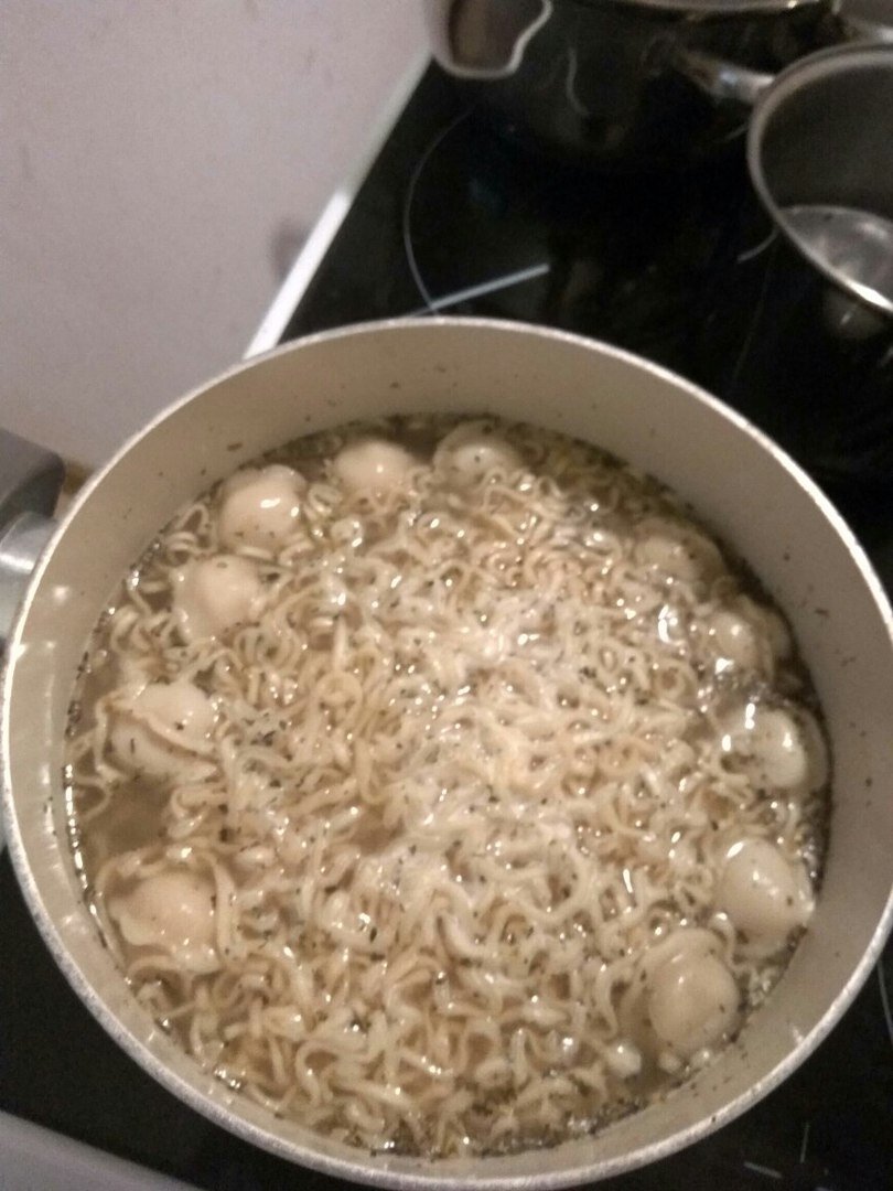 Заливаем кастрюлю водой ≈3/4. Когда вода закипит, кладём туда Дошик и засыпаем пакетик специй. Немного поварив лапшу, закидывает туда пельмени. Добавляем все специи и лавровый лист. Варим. Режим картофффан и добавляем его в наш "недосупец". Даём ему немного настояться и всё! Суп готов, приятного аппетита)0))