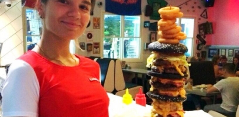 Но получилась какая-то башня из кучи ингредиентов. Ресторан «Лаки Стар» в честь дня рождения гамбургера решили создать самый большой в городе бургер. Весом блюдо получилось около килограмма, а в высоту – почти 35 сантиметров. 118 лет назад американский гастроном Луи Лессинг в городе Нью-Хейвен продал первый гамбургер. Он был первым, кто положил традиционный немецкий бифштекс между двумя круглыми булочками, добавил соус и листик салата. Сотрудники вологодского ресторана шли на рекорд и не пожалели ингредиентов: 8 бифштексов из рубленой говядины, 16 ломтиков сыра, 2 двойные черные булочки, жареный бекон, томат, листья салата, луковые кольца, чиз-фри, наггетсы, картофель фри. Все это творение сверху посыпали кунжутом. Автор назвал блюдо «Башней». Насколько это калорийно, остается только гадать. https://gorodvo.ru/news/society/6399/