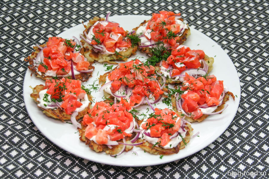 Добрый день! Честно говоря, долго думал размещать данный рецепт или нет, поскольку очень похожий вариант в этом блоге уже есть. Однако, повторение — мать учения, тем более, что тут иной процесс приготовления, да и по ингредиентам этот вариант немного отличается. Продуктовый набор: Картошку чистим и трем на крупной терке. Откидываем на дуршлаг и даём стечь жидкости: Белый лук режем мелко и добавляем к картофелю: Туда же отправляется яйцо: ...мука и перец: Все тщательно перемешиваем: Формируем из картофельной массы плоские котлеты и обжариваем на небольшом количестве растительного масла до румяной корочки: Переворачиваем и обжариваем с другой стороны: Готовые оладьи откладываем в сторону остужаться: Тем временем режем рыбу и красный лук: Сервируем. Сперва сметана: Потом немного лука и рыба. Сверху можно присыпать зеленью для красоты: Приятного аппетита!