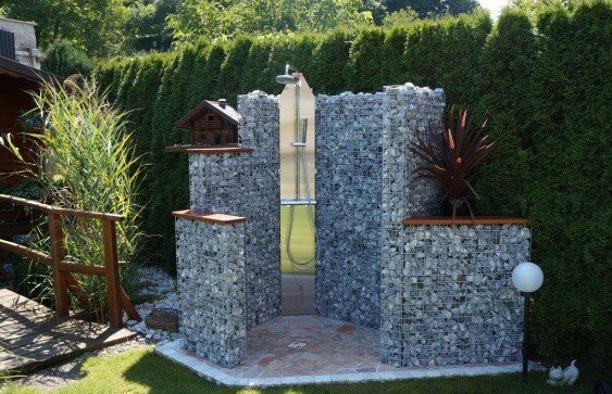 Сегодня мы рассмотрим несколько идей, которые помогут создать полезные и интересные объекты на Вашем загородном участке Забор с фундаментом из габионов Такие заборы не нуждаются в бурении глубоких отверстий под столбы, сооружении опалубки и заливки бетоном фундамента. Опорную конструкцию из габиона можно укладывать сразу на грунт. Более того! В отличии от бетона, который все же постепенно разрушается, фундамент из габионов, с течением времени становиться более надежным! Ему можно придать любую форму, дополнить деревянными вставками, евроштакетником или любым другим материалом, на Ваш выбор. Летняя кухня, мангал, барбекю Конструкции из габионов не боятся огня, им можно придавать любую форму и размер. Благодаря этим качествам, их можно использовать при создании полноценной и удобной летней кухни, удобного и функционального мангала, или для организации очага для открытого огня. Изделия из габионов не бояться влажности. Поэтому их часто используют для создания объектов, связанных с постоян