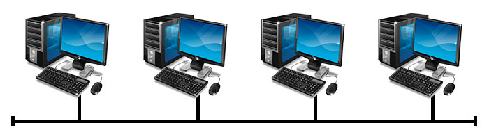 Существует три основных вида топологии: шина, кольцо и звезда. Линейная шина Все компьютеры подключены к единому кабелю с заглушками по краям (терминаторами). Заглушки необходимы для предотвращения отражения сигнала. Принцип работы шины заключается в следующем: один из компьютеров посылает сигнал всем участникам локальной сети, а другие анализируют сигнал и если он предназначен им, то обрабатывают его. При таком взаимодействии, каждый из компьютеров проверяет наличие сигнала в шине перед отправкой данных, что исключает возникновения коллизий. Минус данной топологии — низкая производительность, к тому же, при повреждении шины нарушается нормальное функционирование локальной сети и часть компьютеров не в состоянии обрабатывать либо посылать сигналы. Кольцо В данной топологии каждый из компьютеров соединен только с двумя участниками сети. Принцип функционирования такой ЛВС заключается в том, что один из компьютеров принимает информацию от предыдущего и отправляет её следующему высту